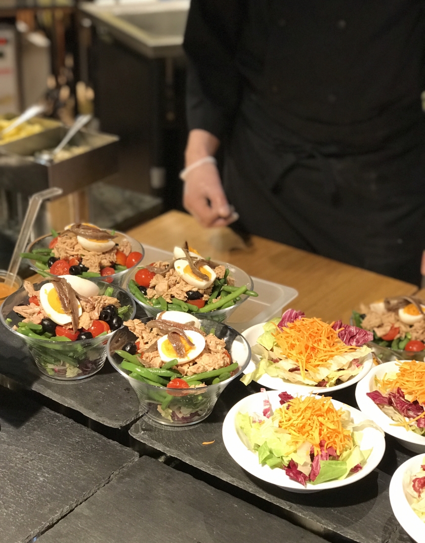 Potete sempre scegliere fra delle delle insalate, alcuni primi, 3 secondi fra pesce e carne con i contorni e naturalmente una bella fetta di torta!