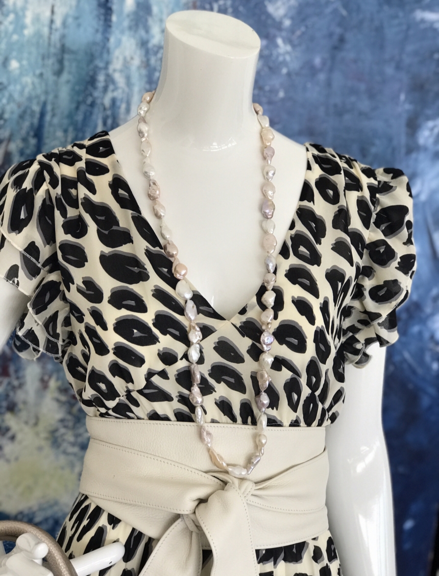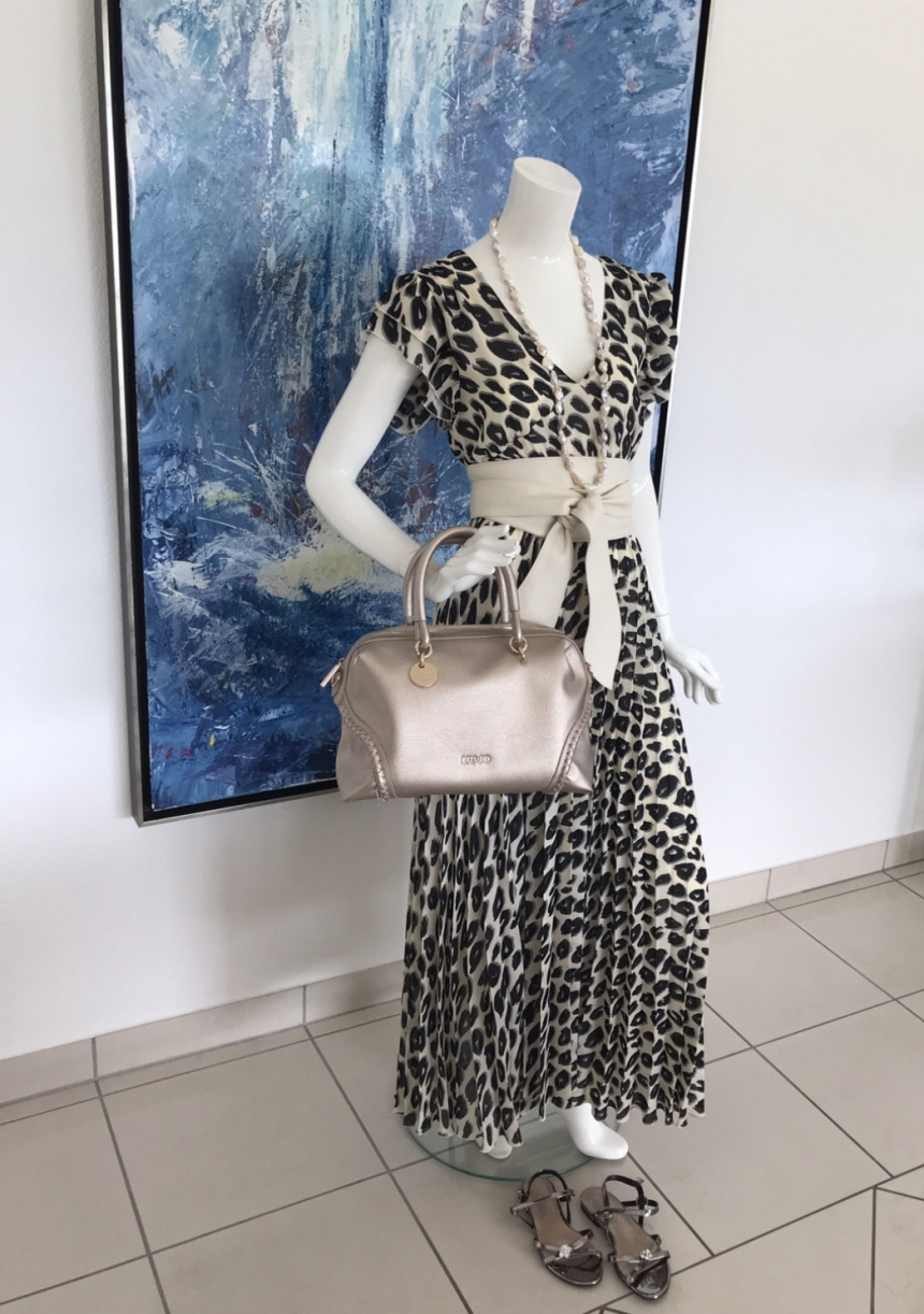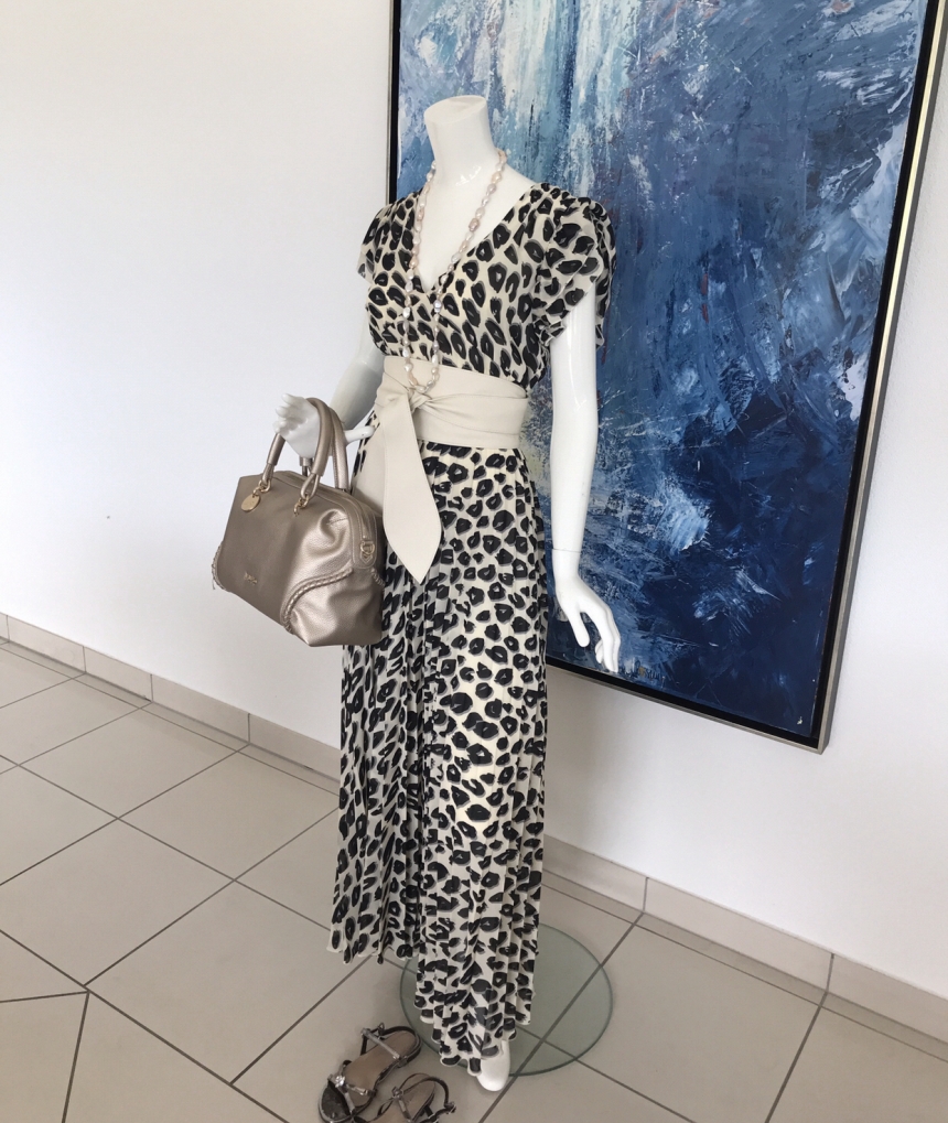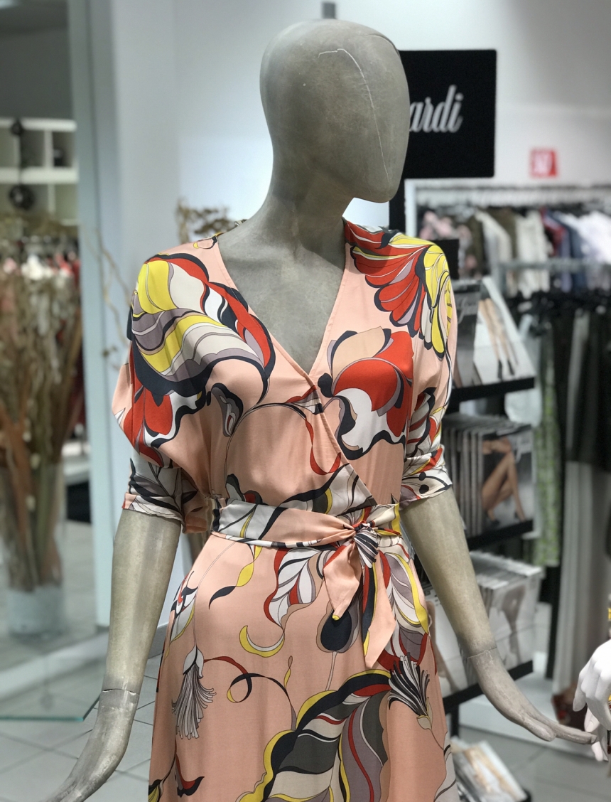 Delicato Jungle Style con vestito chiusura portafoglio, o pantalone comodo con coulisse disponibile su sfondo rosa antico o panna.