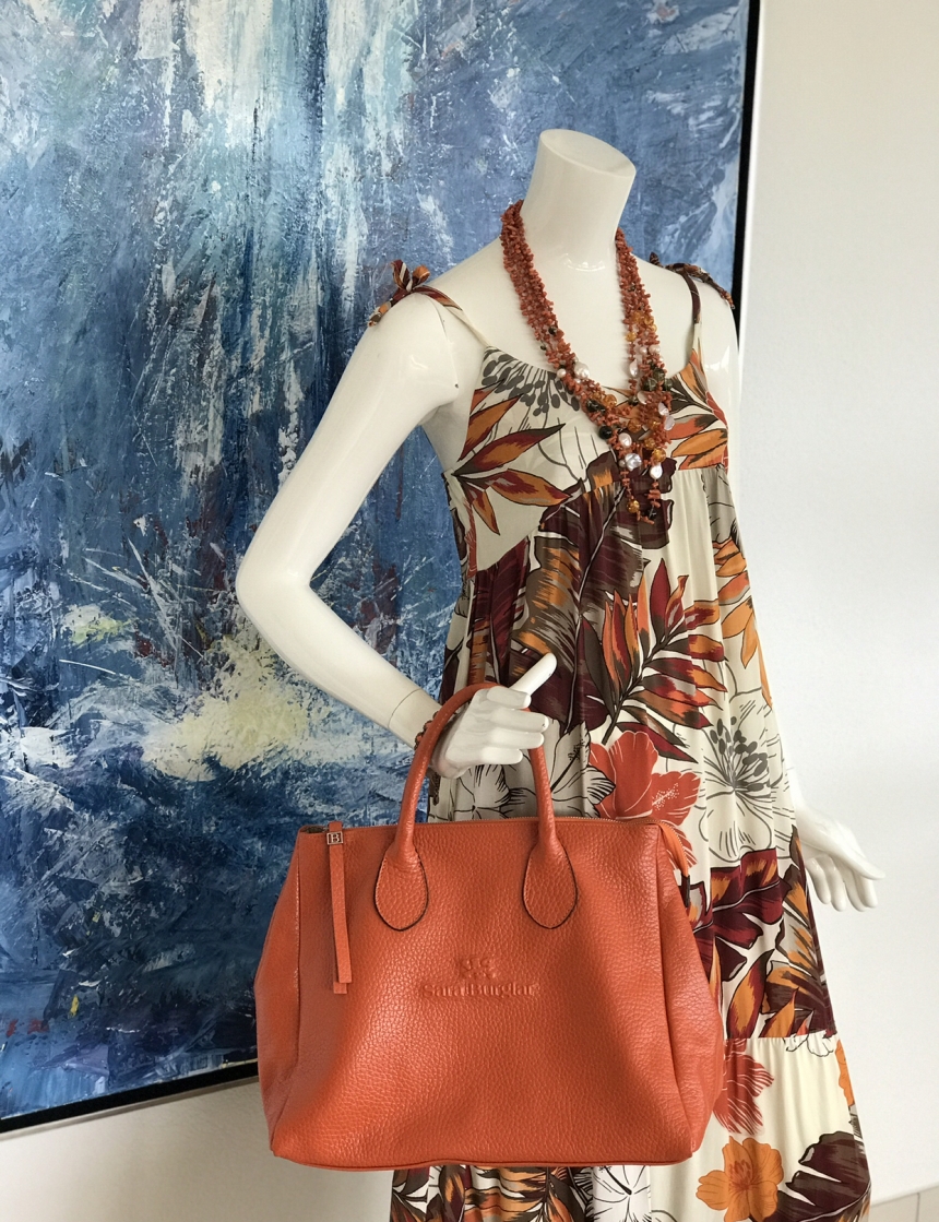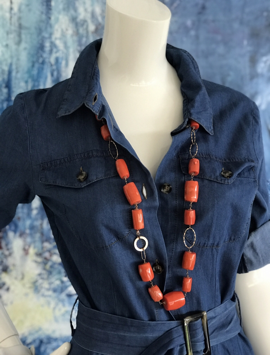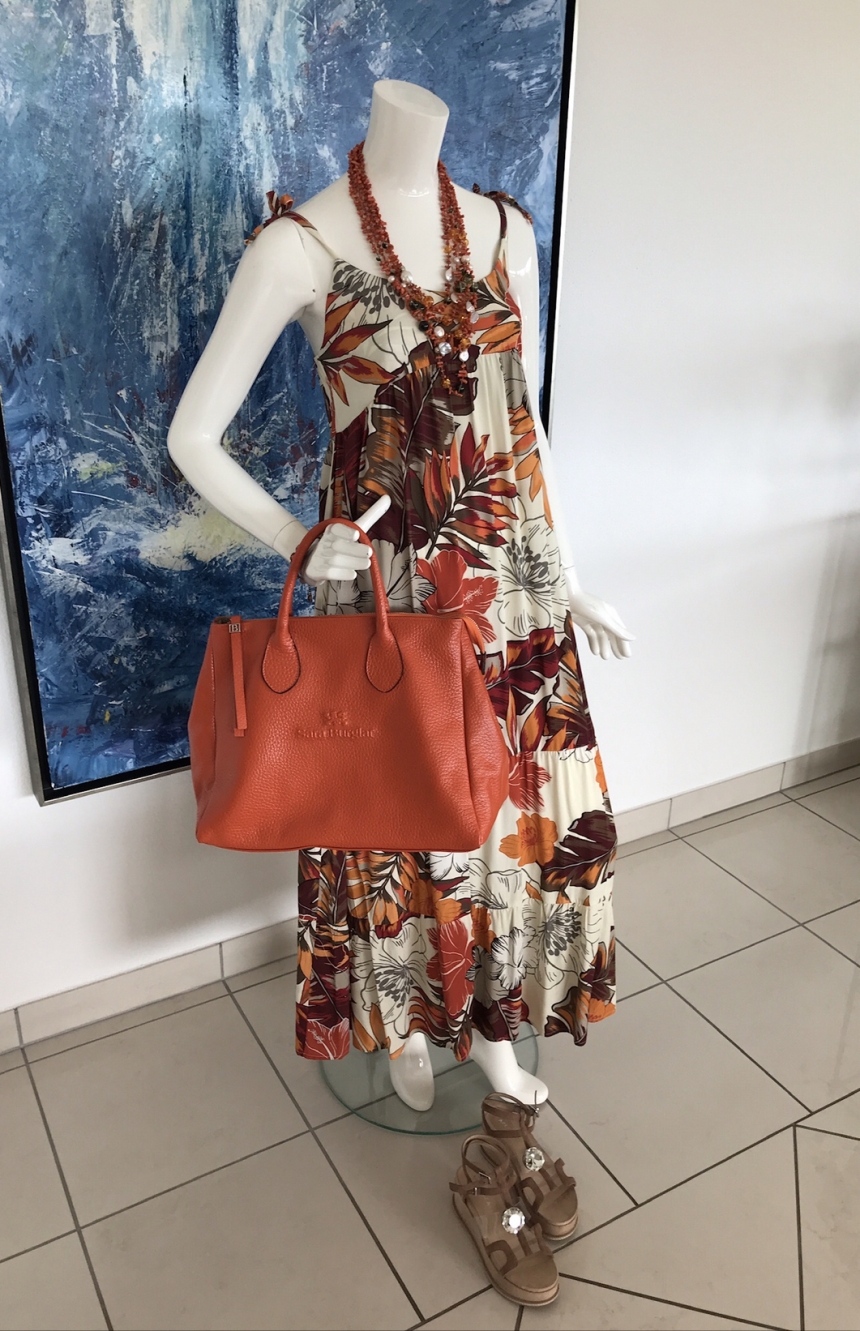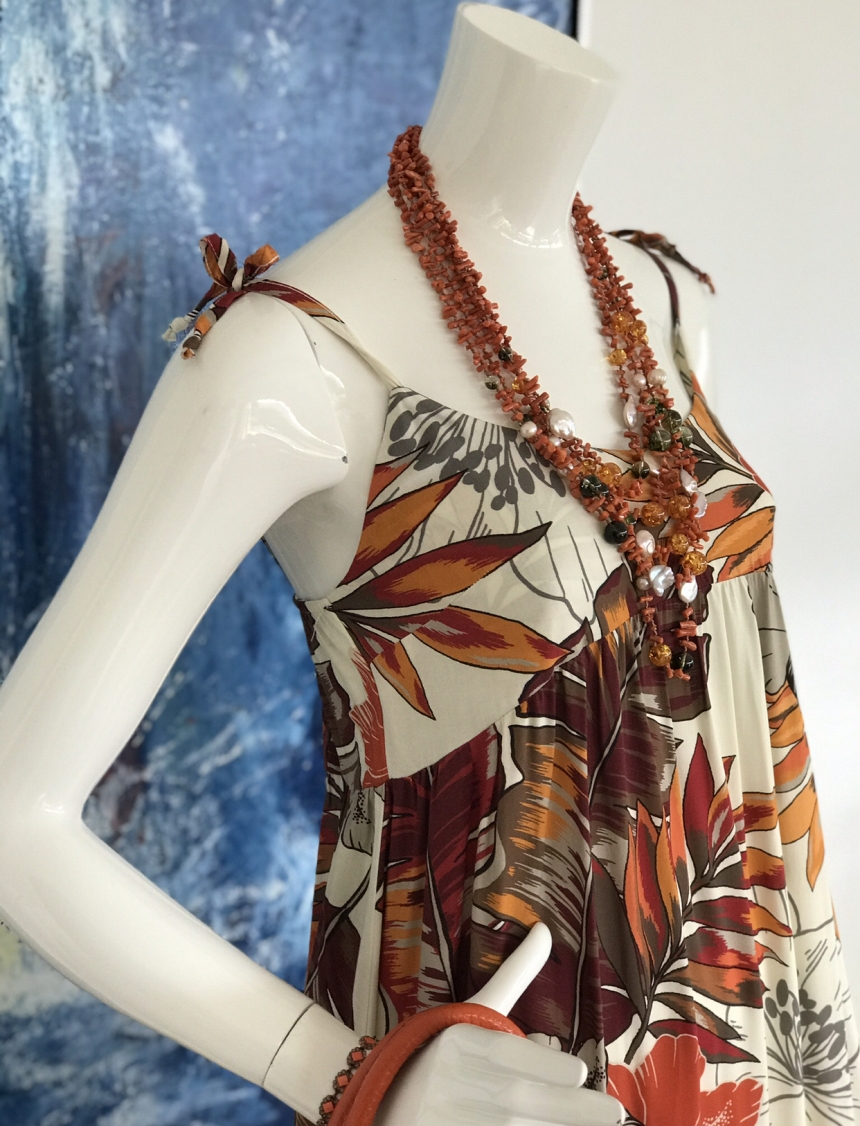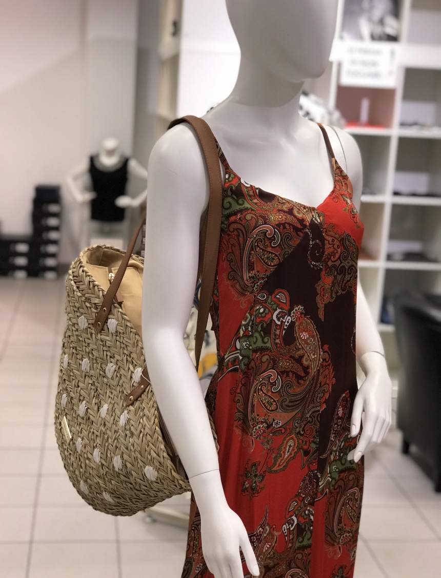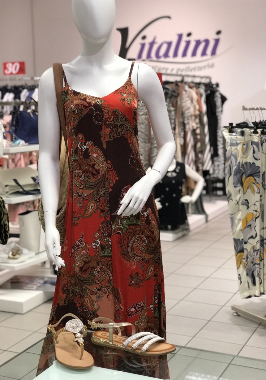 Maxi dress stampa paisley nei caldi toni del rosso corallo, tabacco e punte d'oro, disponibile in due versioni, quella con spallina sottilie e quella chemisier con la manica e i bottoncini. La versione chemisier è adatta anche all'autunno se indossata con giubbino in pelle e stivali.