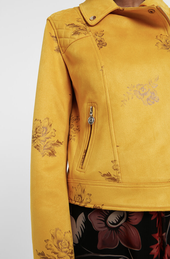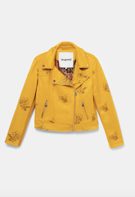 Ad esempio questa giacca slim da biker in similpelle, in stile boho con scollo con risvolti, zip incrociata e guarnizioni metalliche con un’elegante stampa di fiori in tinta e una colorata fodera interna a forme geometriche.