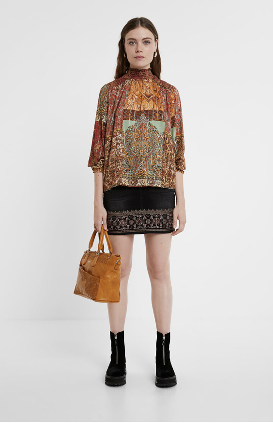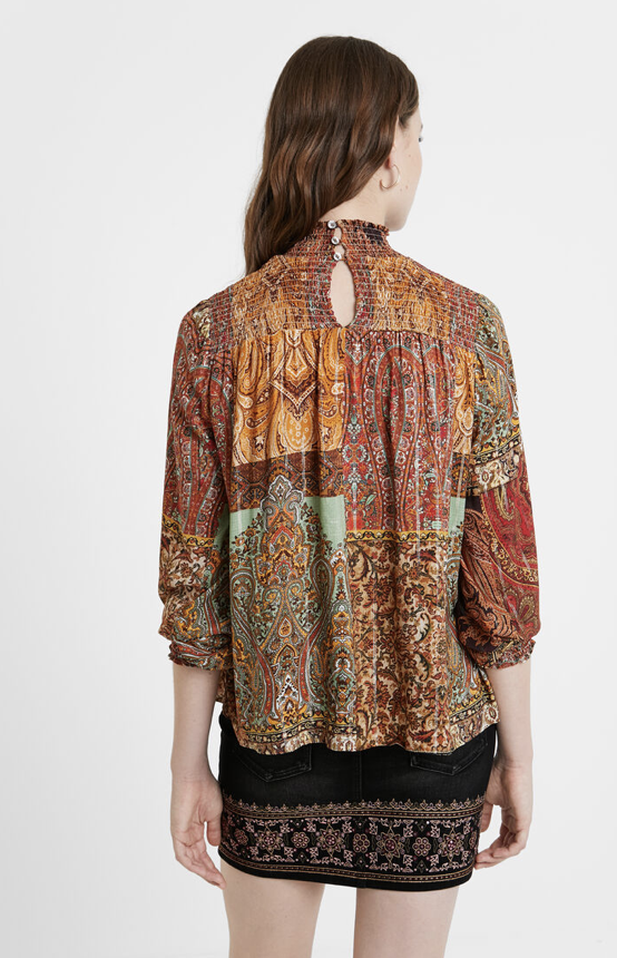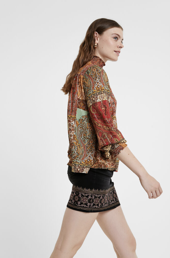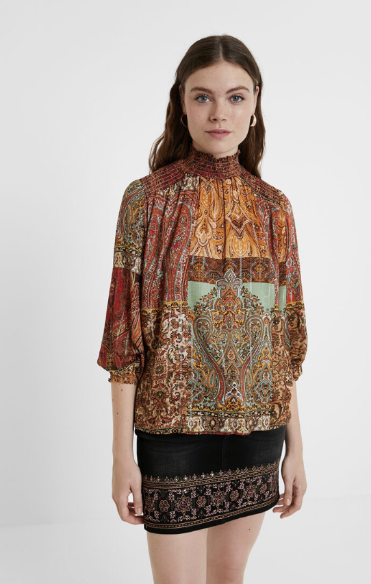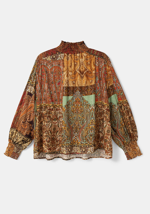 Oppure la blusa stampa marocchina con fili di lurex in viscosa, dal modello morbido, con collo alto e arricciato. I polsini, anch’essi increspati, conferiscono alle maniche un leggero effetto a palloncino. Assolutamente stupenda!