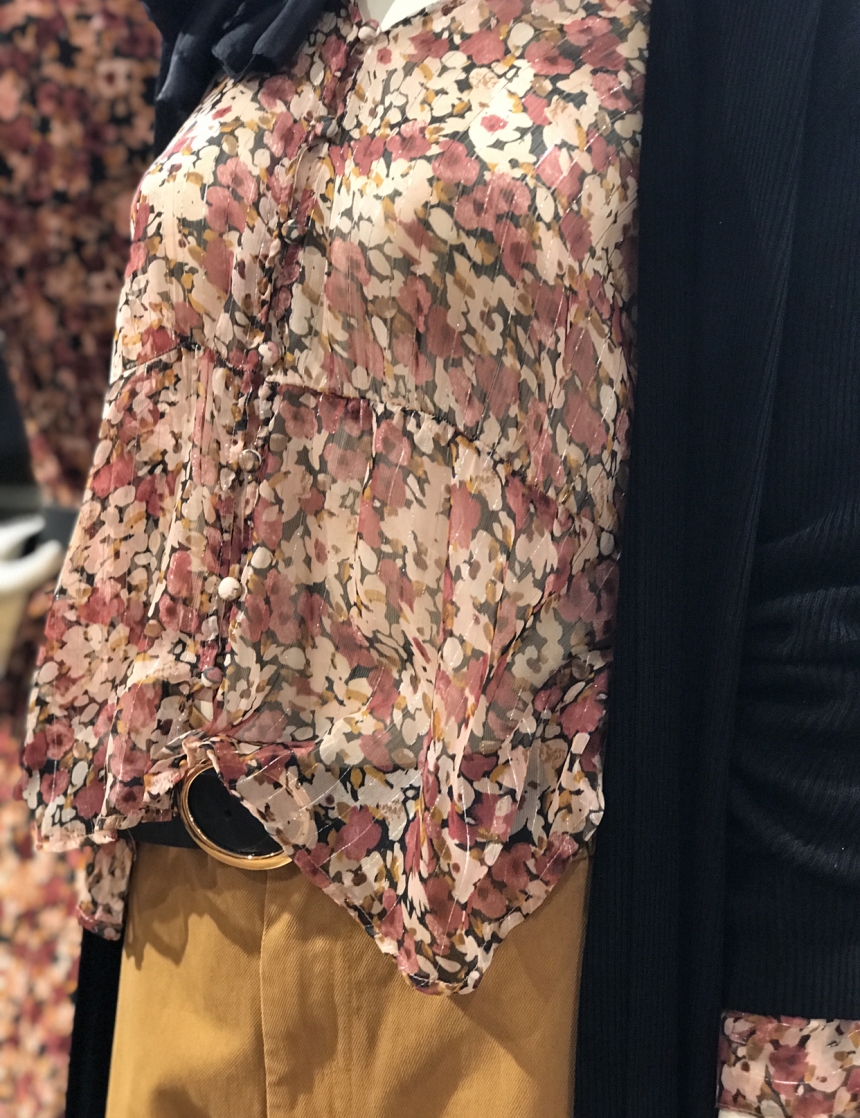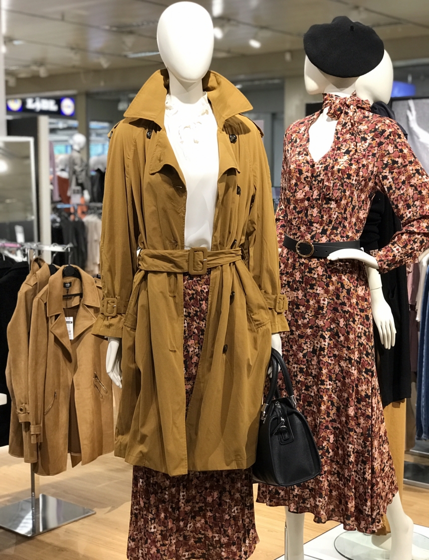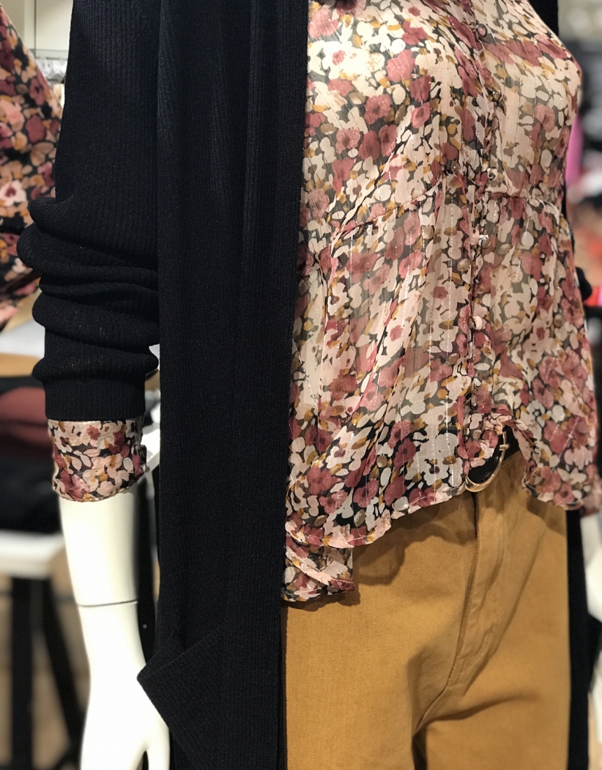 A me piace molto il trench lungo color senape, i pantaloni in dainetto neri e la camicetta floreale.