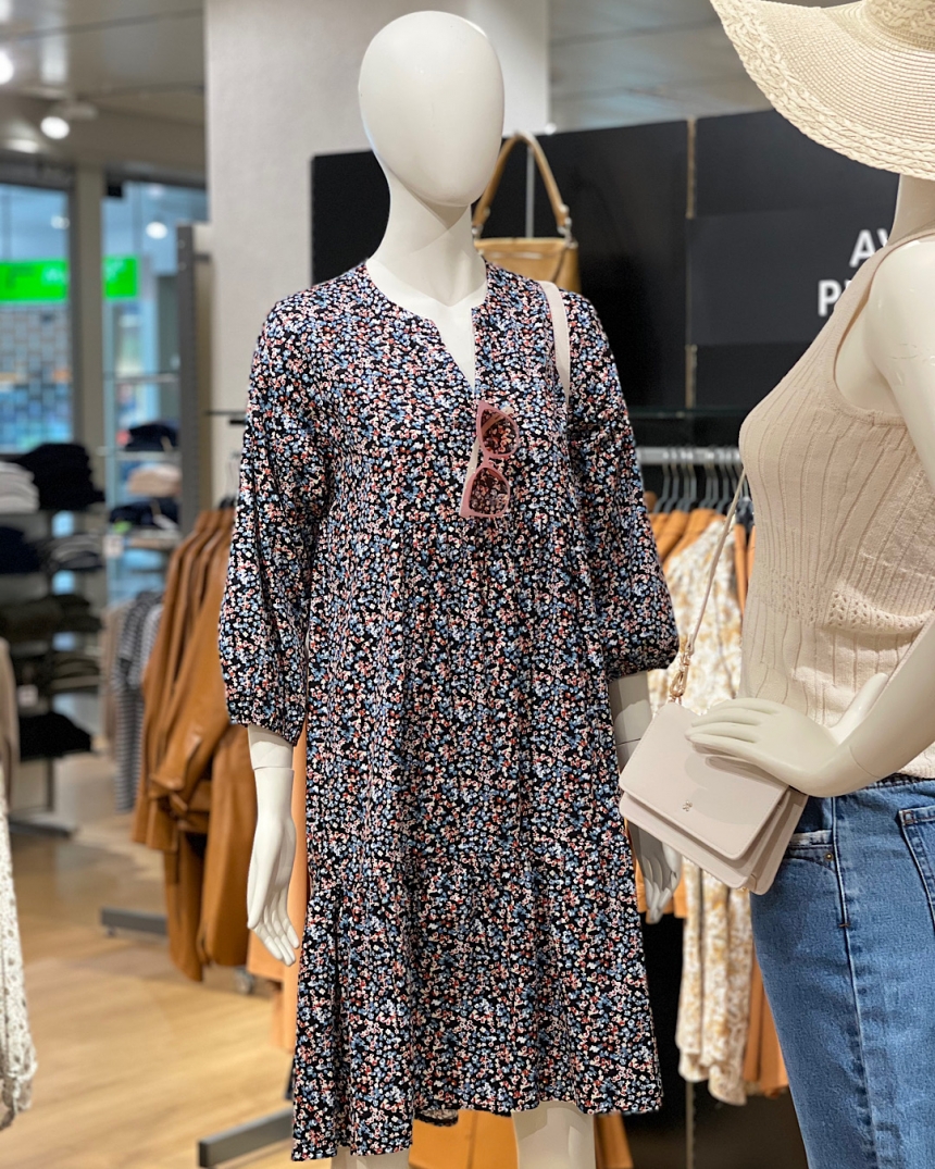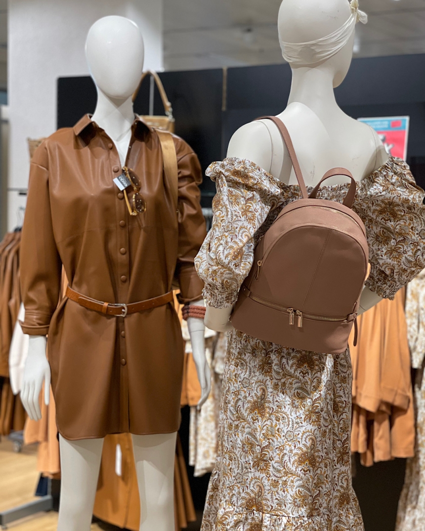 Mini abito in ecopelle nel color cuoio, abito lungo a fiorellini nei toni del beige e molto altro ancora.