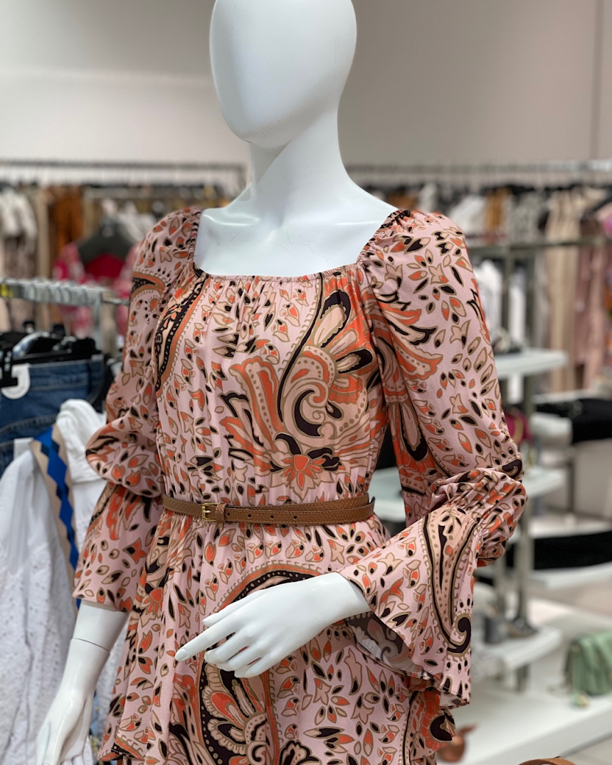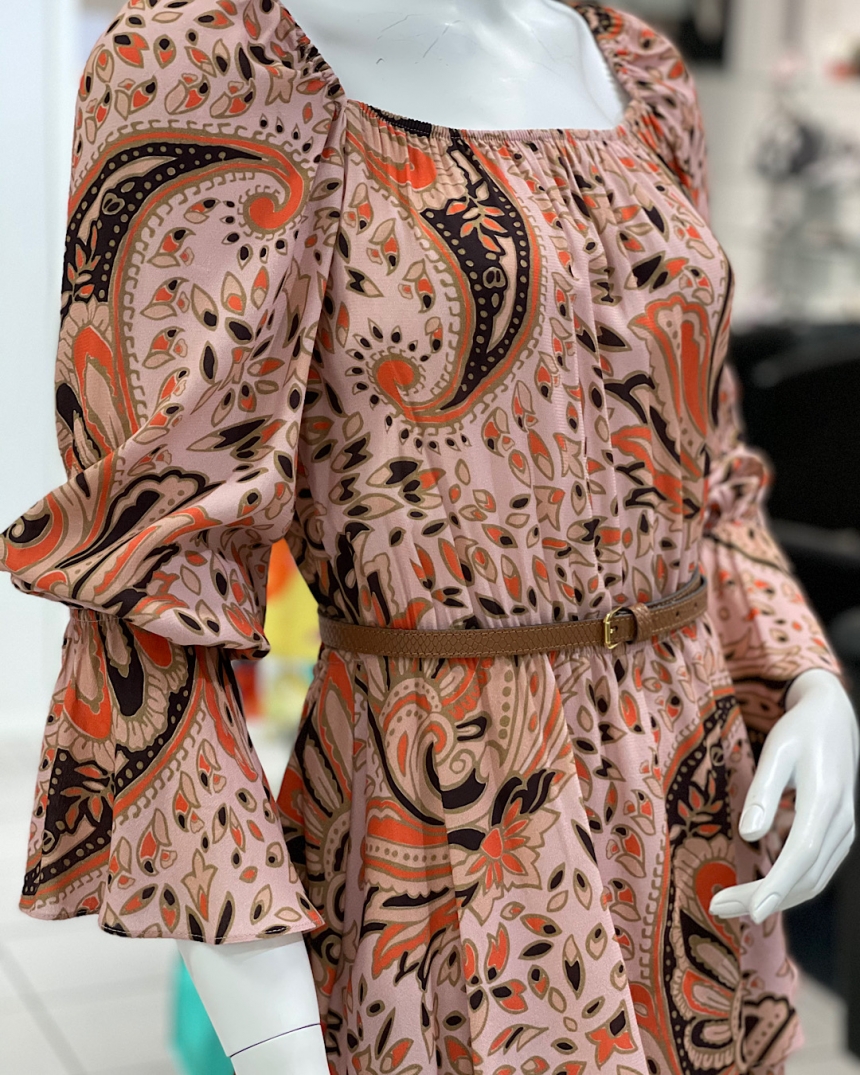 Abito con fantasia cashmere, nei caldi colori del rosa antico, con punte di arancione e nero, abbinato con accessori color cuoio. Un outfit raffinato e di gran classe.