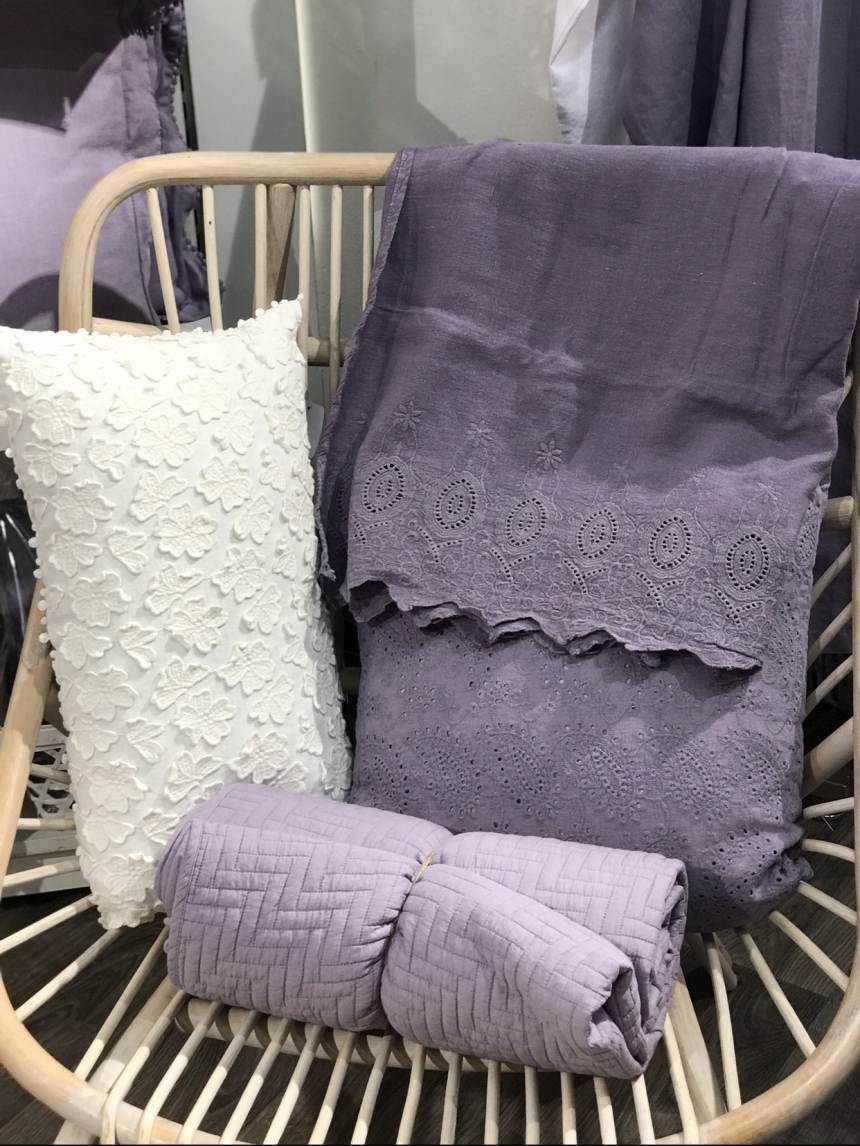 Fosse per me sostituirei la biancheria ad ogni stagione, però quella di quest'anno è la mia preferita in assoluto. Per ottenere questo effetto mi bastarebbe la coperta plaid color lavanda, 2 due o tre cuscini, modello flora, loulu o Jolie. Voi cosa ne pensate?