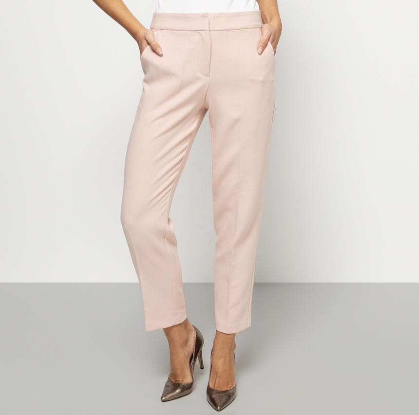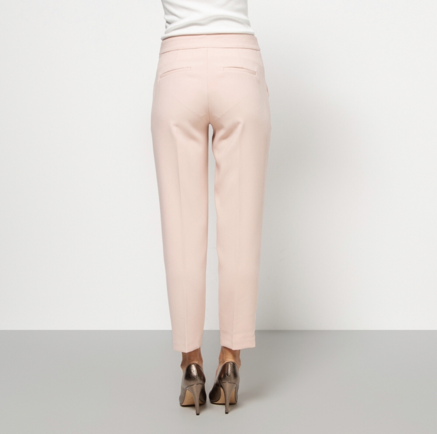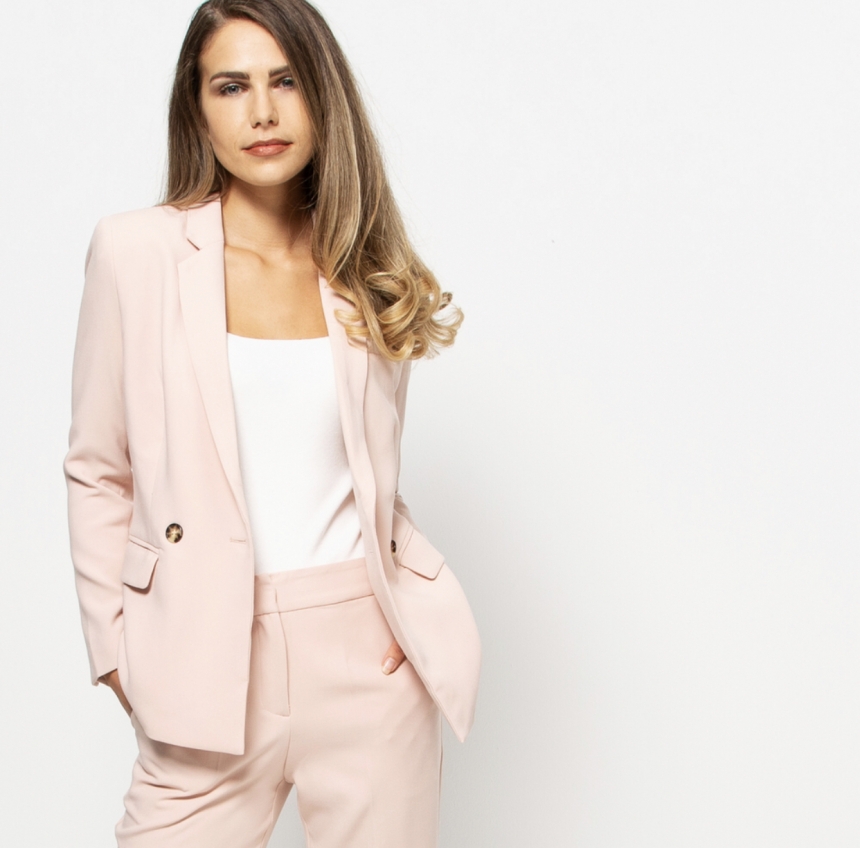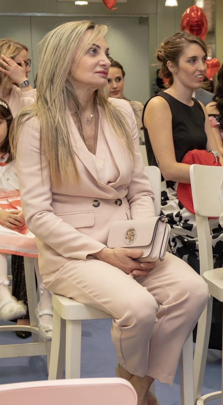 Si tratta di un tailleur giacca e pantalone, di color rosa pastello, con camicetta 3/4 abbinata. Tutti e tre i capi sono di Avant Premiere by Manor. Quale accessorio è stata abbinata una borsetta Guess, sempre di colore rosa.