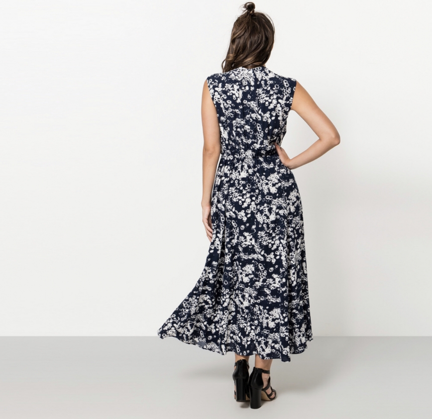 Il tema dominante è floreale, allegri fiorellini bianchi su sfondo blu. Le varianti sono o l'abito lungo senza maniche da completare eventualmente con maglioncino blu o giacchino di jeans, oppure jeans bianchi o i classici denim con camicetta.