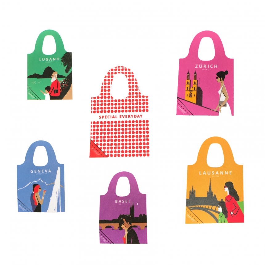 Per ogni colore è raffigurata una città svizzera con il suo simbolo. Si piegano facilmente, e diventano delle dimensione di un pugno. Si tengono in borsa e quando acquisti qualcosa non devi più farti dare il classico sacchetto di plastica o di carta e contribuisci quindi con stile a preservare il nostro ambiente.