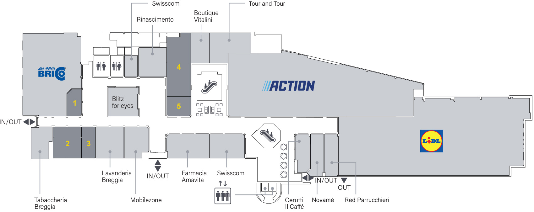 Alcuni marchi contribuiscono già oggi in modo significativo all'attrattività del Centro Breggia. È il caso di Lidl, punto di riferimento per la spesa alimentare, e di Action, insegna discount in forte crescita a livello europeo che si sta affermando anche in Canton Ticino, applicando prezzi equivalenti a quelli adottati in Italia ed attirando una clientela giovane e dinamica. Un ruolo importante è svolto anche da Brico, realtà molto apprezzata a livello cantonale per la qualità dell'offerta e la professionalità nel settore del fai-da-te. Accanto a queste insegne si confermano presenze consolidate e riconosciute come Swisscom, Mobile Zone e Farmacia Amavita, che nel tempo hanno contribuito a costruire un rapporto di fiducia con la clientela locale.